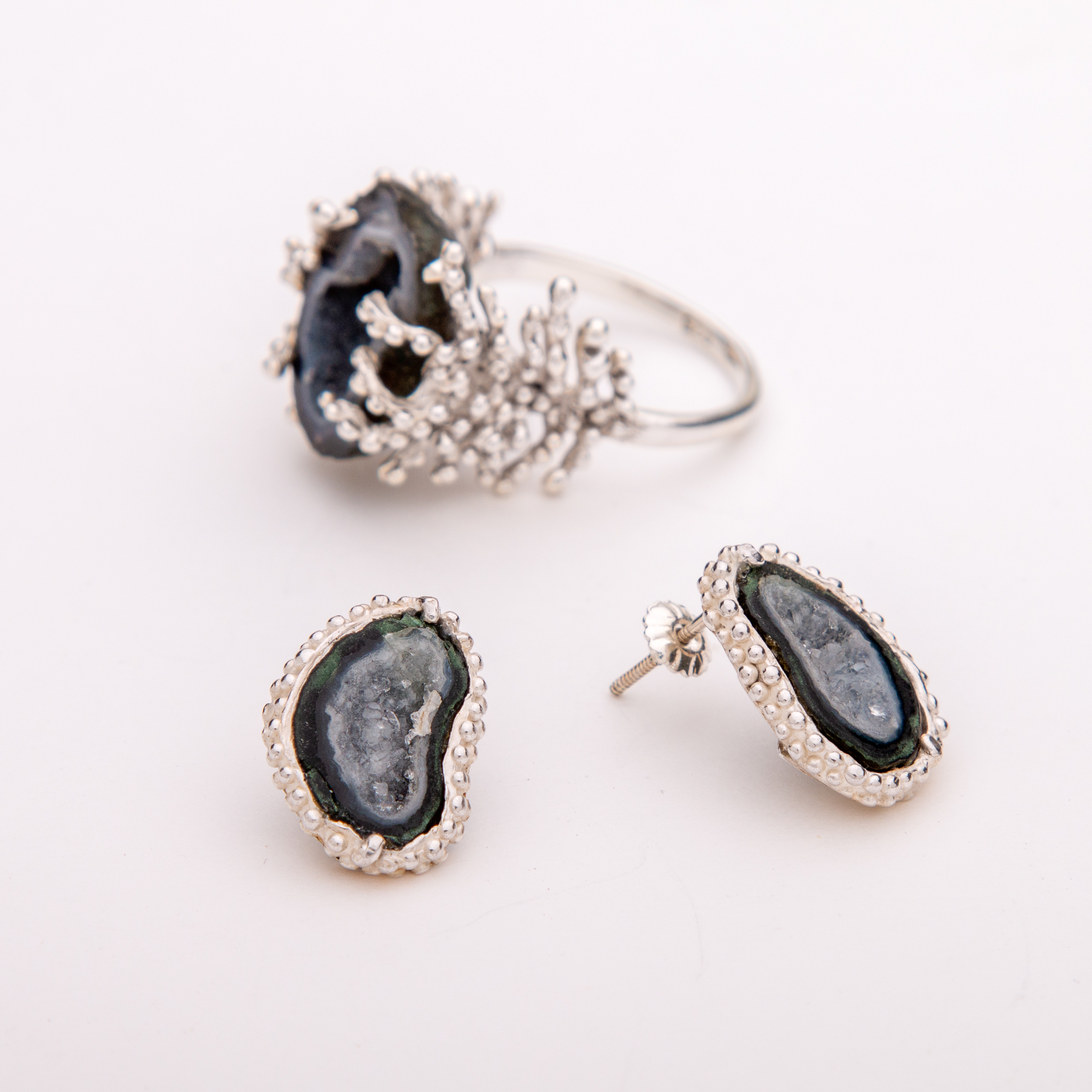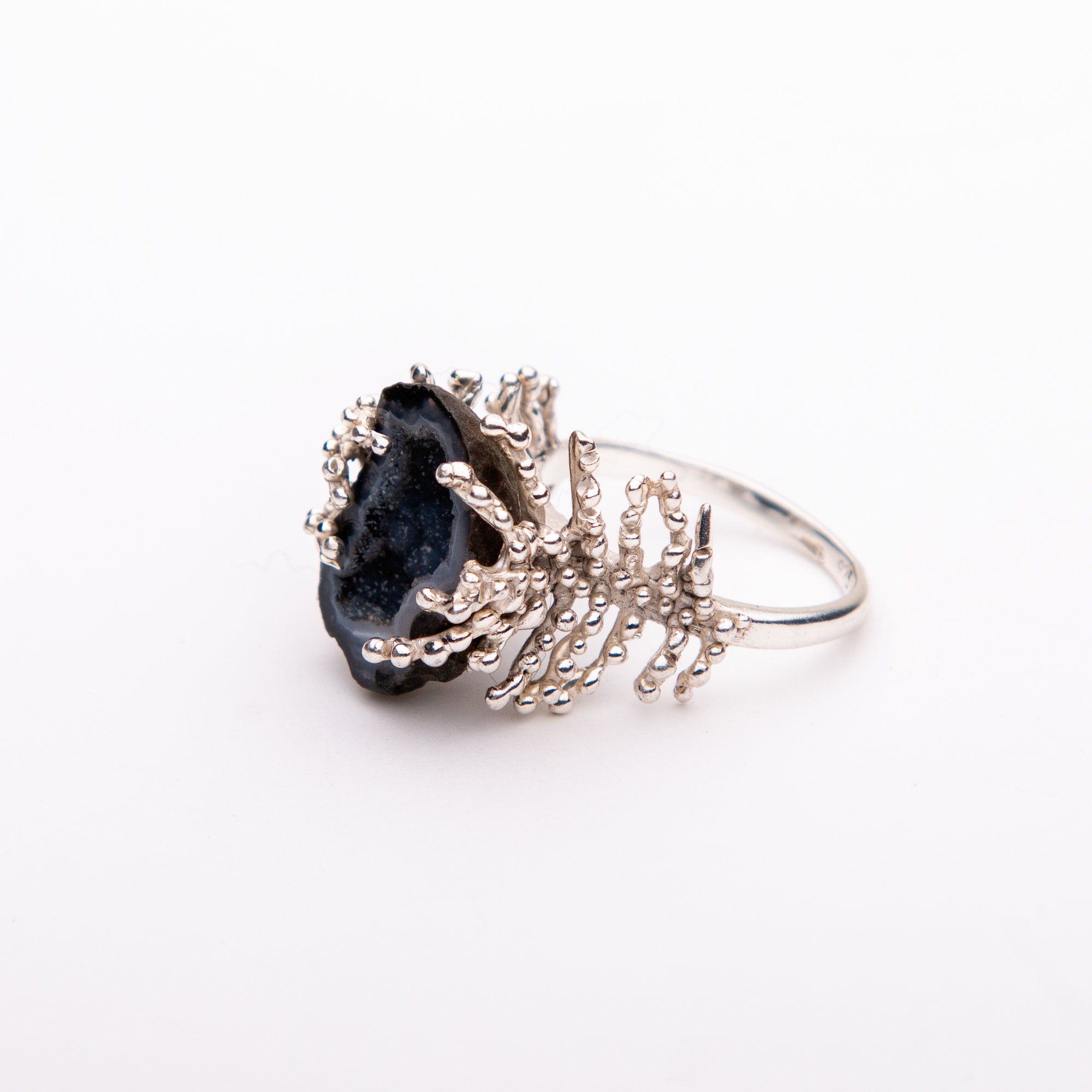 Inspirado en las formas suaves y orgánicas de las esponjas marinas, este es un anillo elaborado a mano en plata de ley 925. Su diseño envuelve una geoda natural. Cada curva y detalle refleja una profunda conexión con la naturaleza. Disponible también en oro de 18 quilates, según tu preferencia. Contáctanos para personalizar esta pieza.